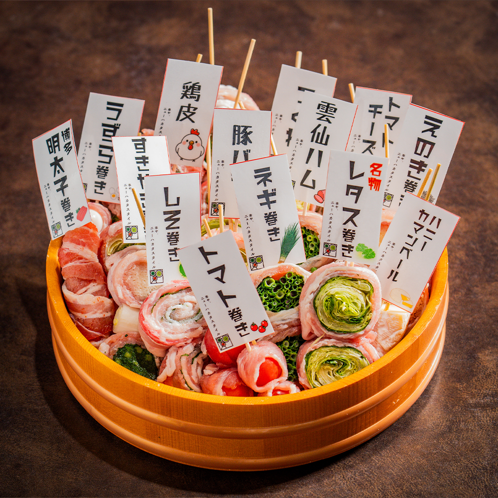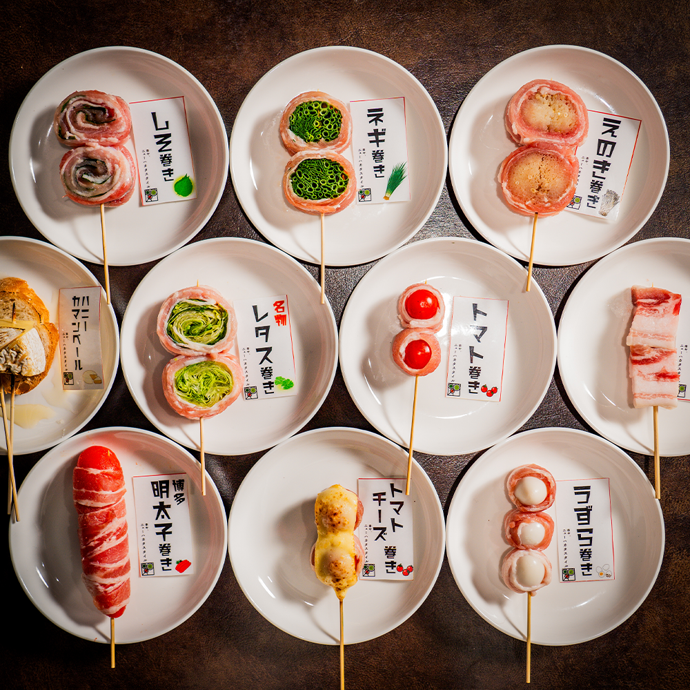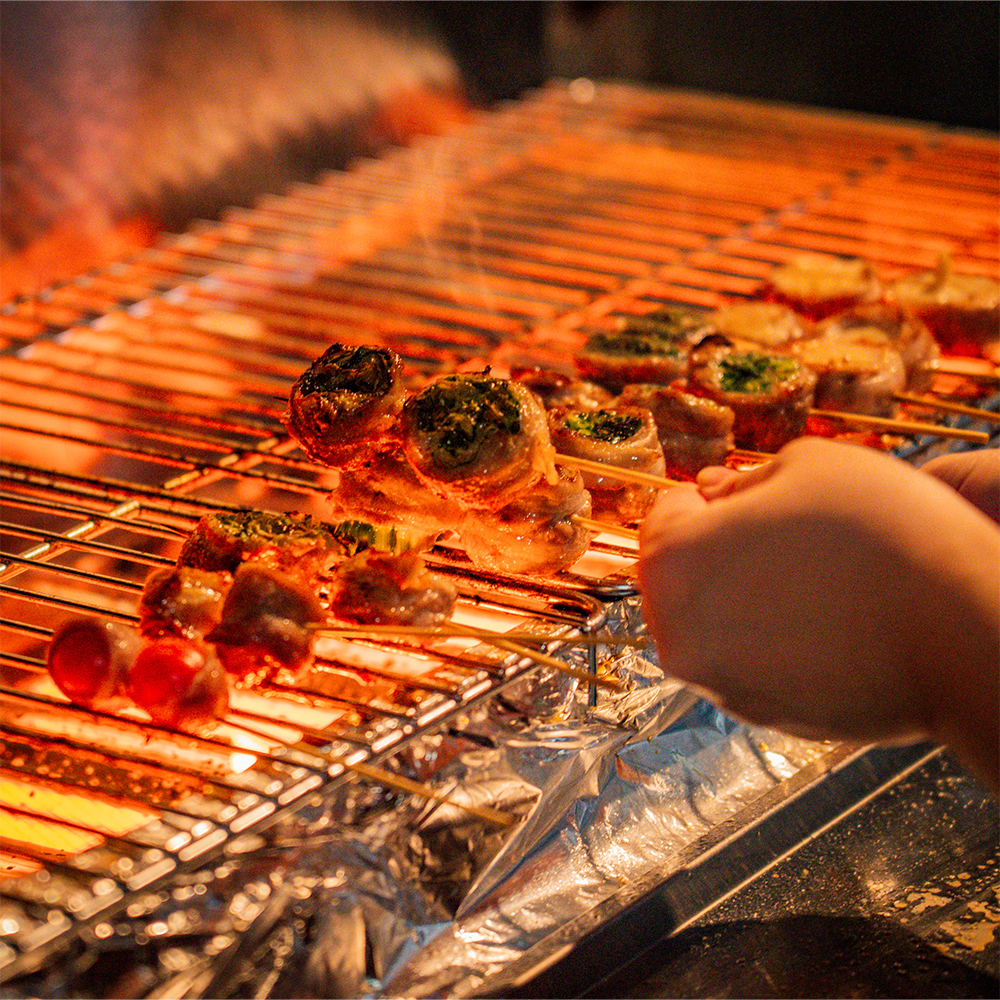 名物の野菜巻き串は、豚バラで巻いた野菜を炭火で焼き上げ、甘みと旨味が絶妙に調和。